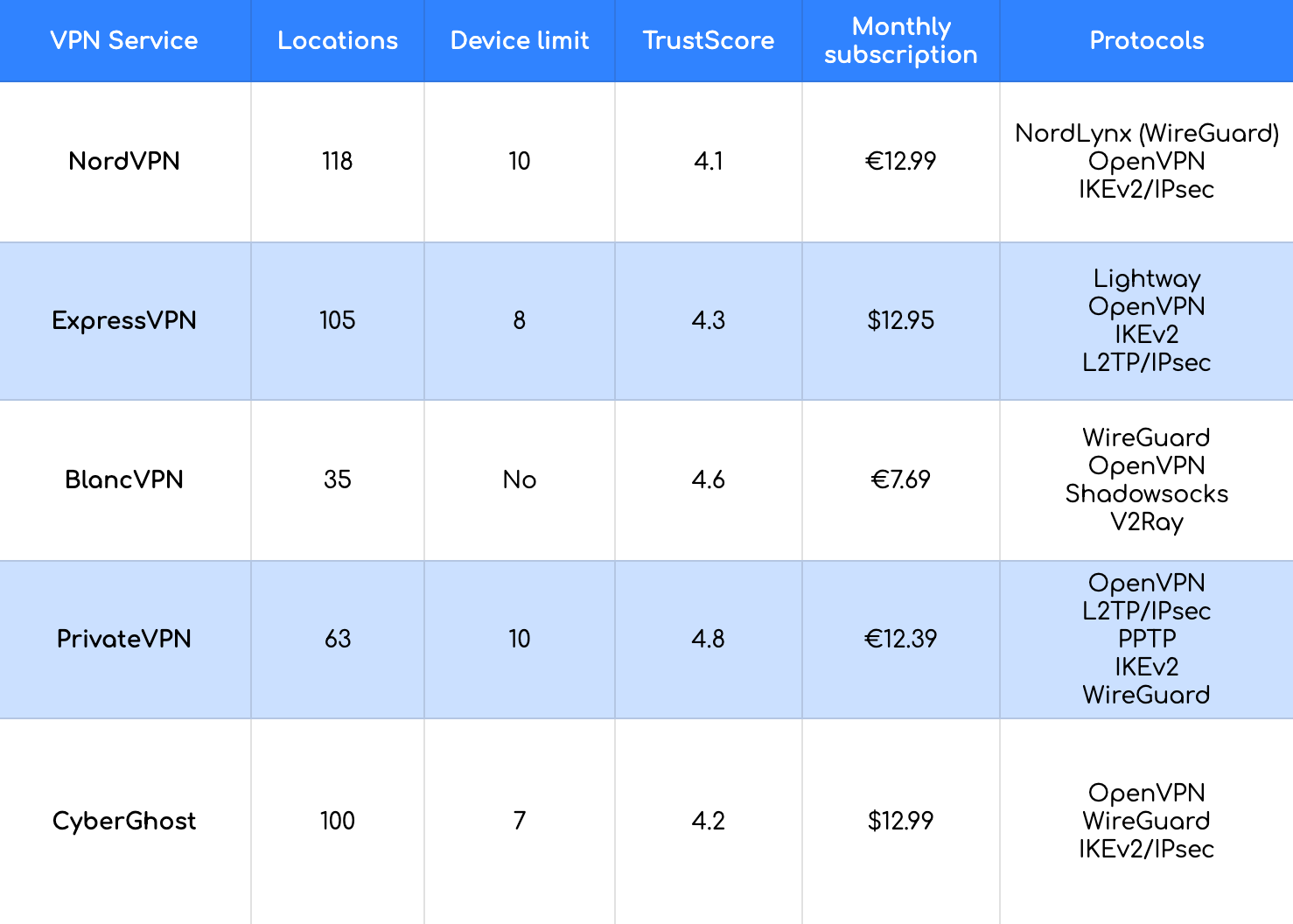 NordVPN's monthly plan without promotions and discounts is the most expensive: 12.99 euros. CyberGhost's is slightly cheaper, at 12.99 US dollars. BlancVPN offers the most affordable option, at 7.69 euros per month.