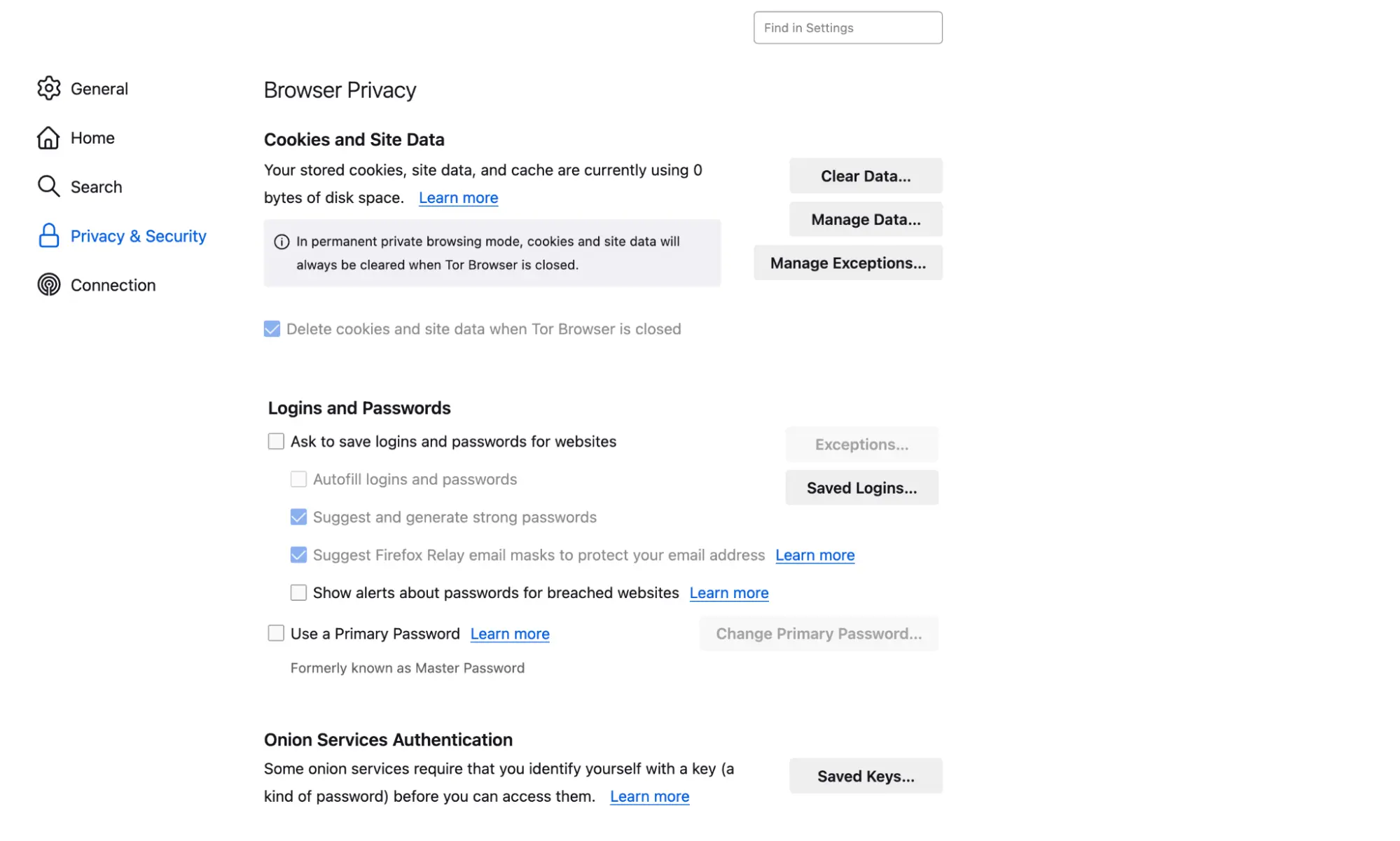 Cookies and Site Data: Regularly select "Clear Data" for privacy. This applies to all browsers. Check "Delete cookies and site data when Tor Browser is closed" to automatically clear cookies upon closing the browser.
