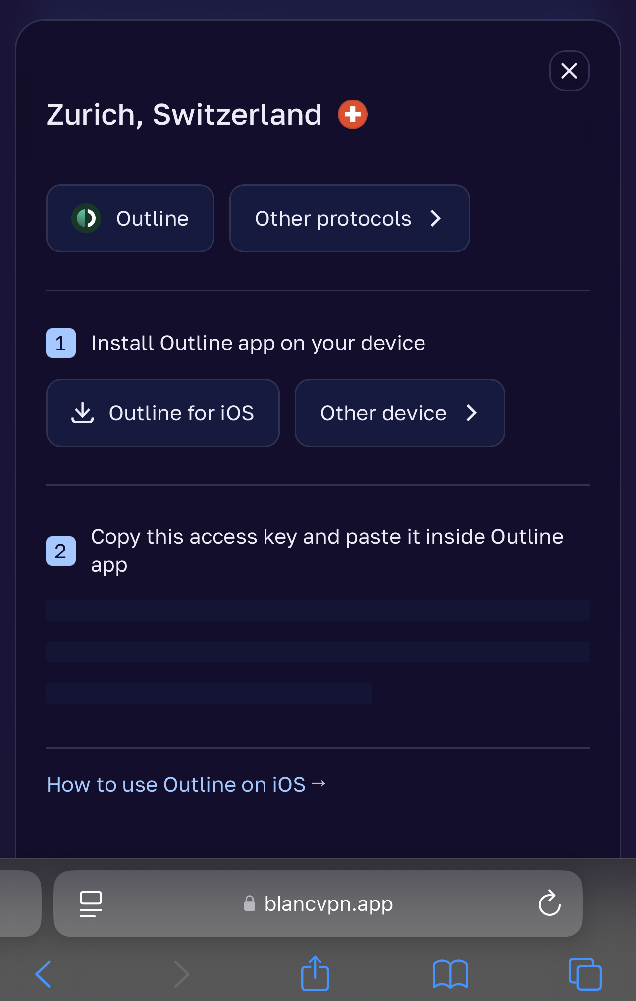The process of installing and setting up BlancVPN on an iPhone is very simple. Instead of a proprietary app, BlancVPN provides its service through the Outline app. Outline is an open-source VPN project based on Shadowsocks that provides secure and fast VPN connections. Follow the steps below: