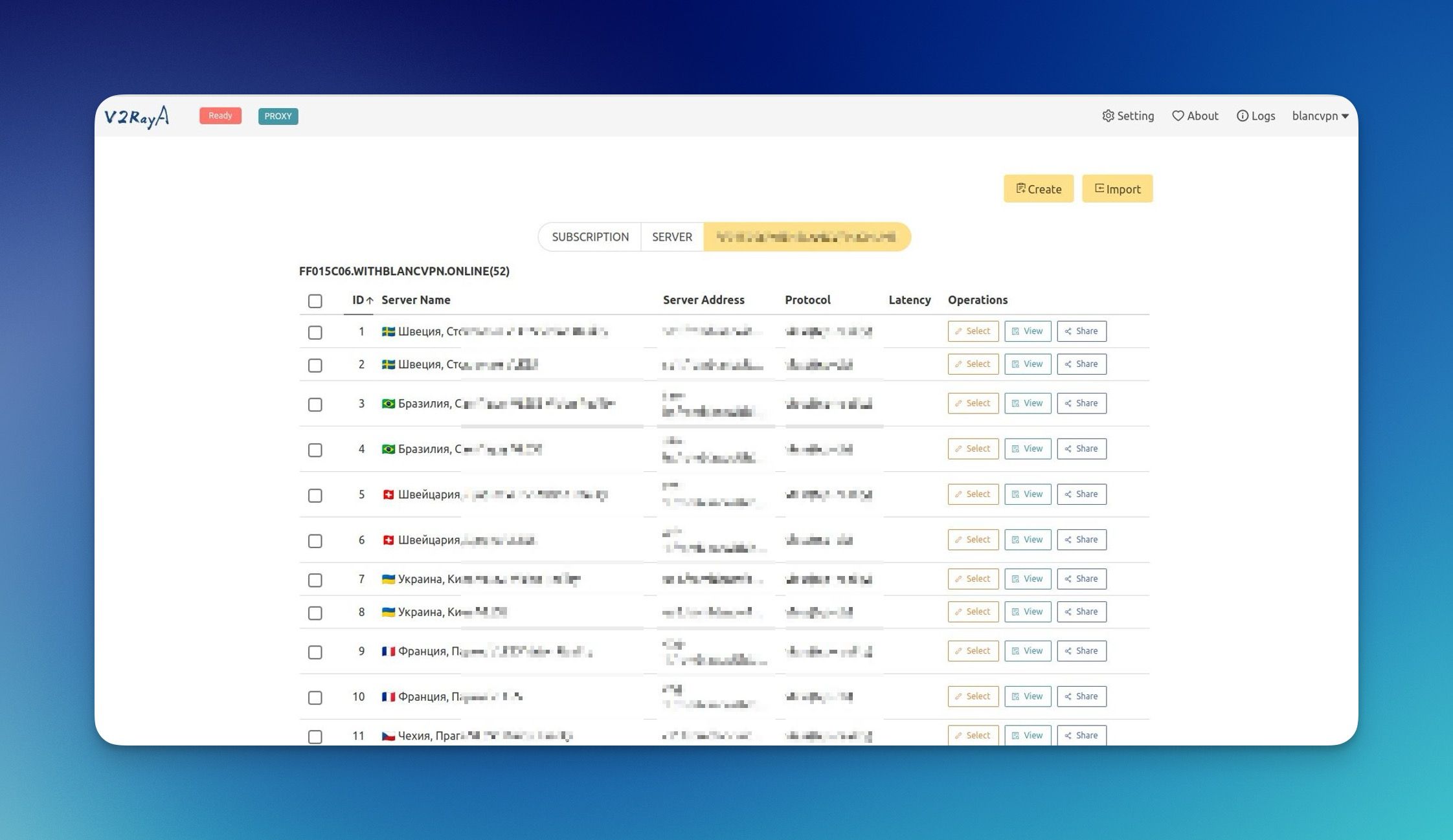 Log in to your BlancVPN account. Click Install → choose the device → Another VPN client → in the Location and protocol column choose V2Ray and copy the key.