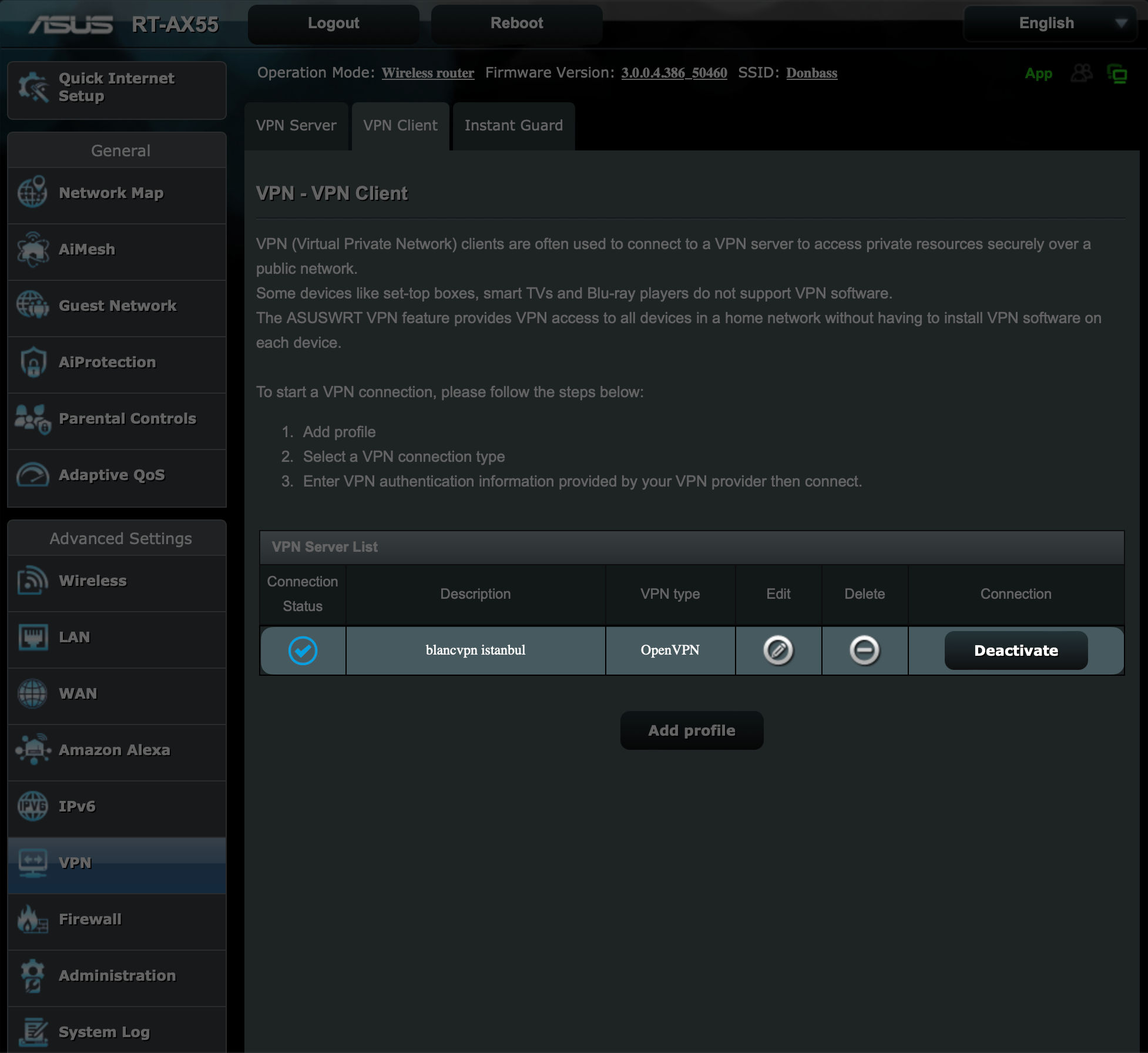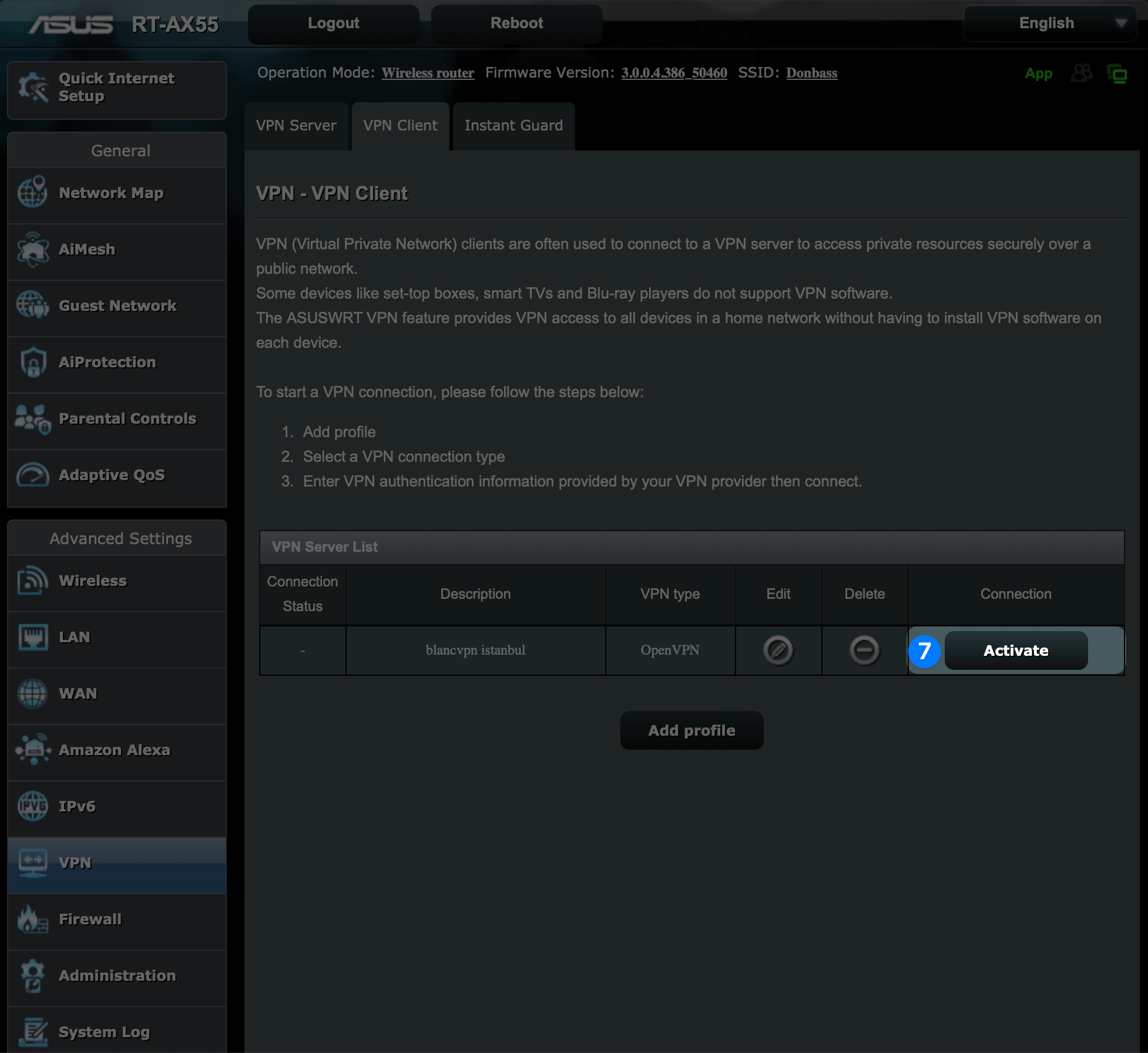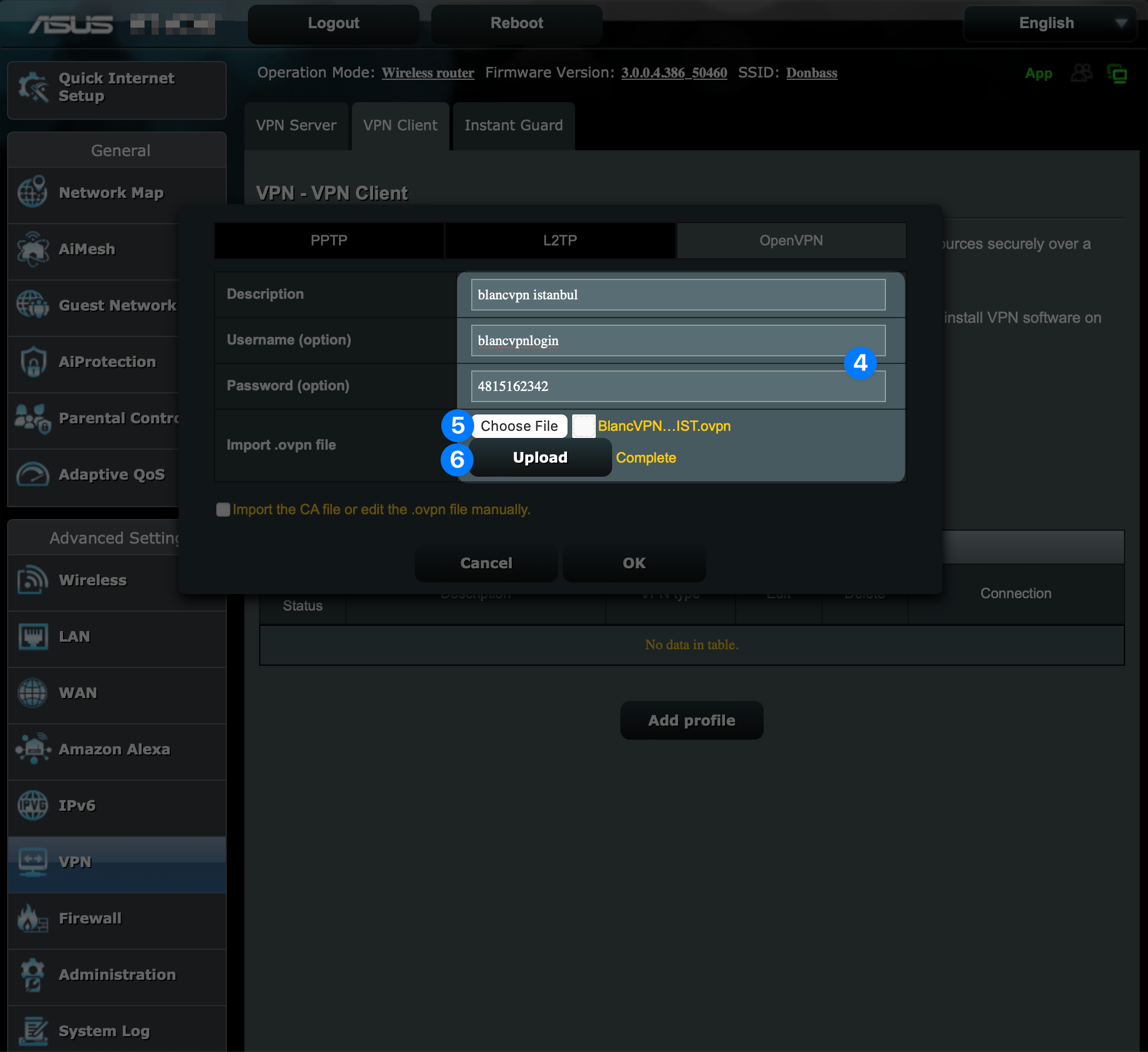 Get the .ovpn configuration file from your BlancVPN account. Click Install → choose the device → Another VPN client → go to setup guide → ASUS → in the Location and protocol column choose OpenVPN and the desired location → download the .ovpn configuration file and copy your login and password.