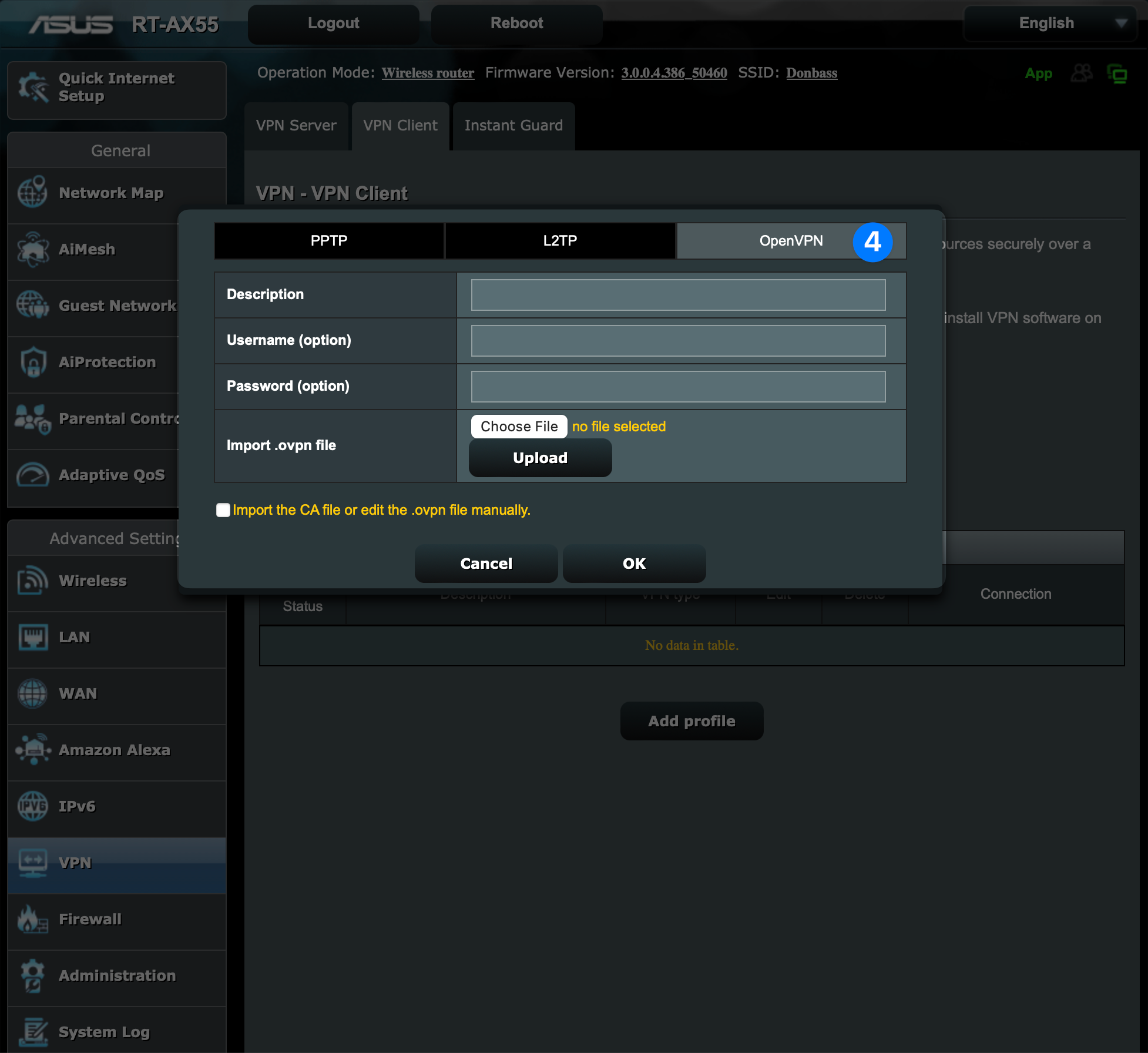 Click Choose File, select the .ovpn configuration file, and click OK.