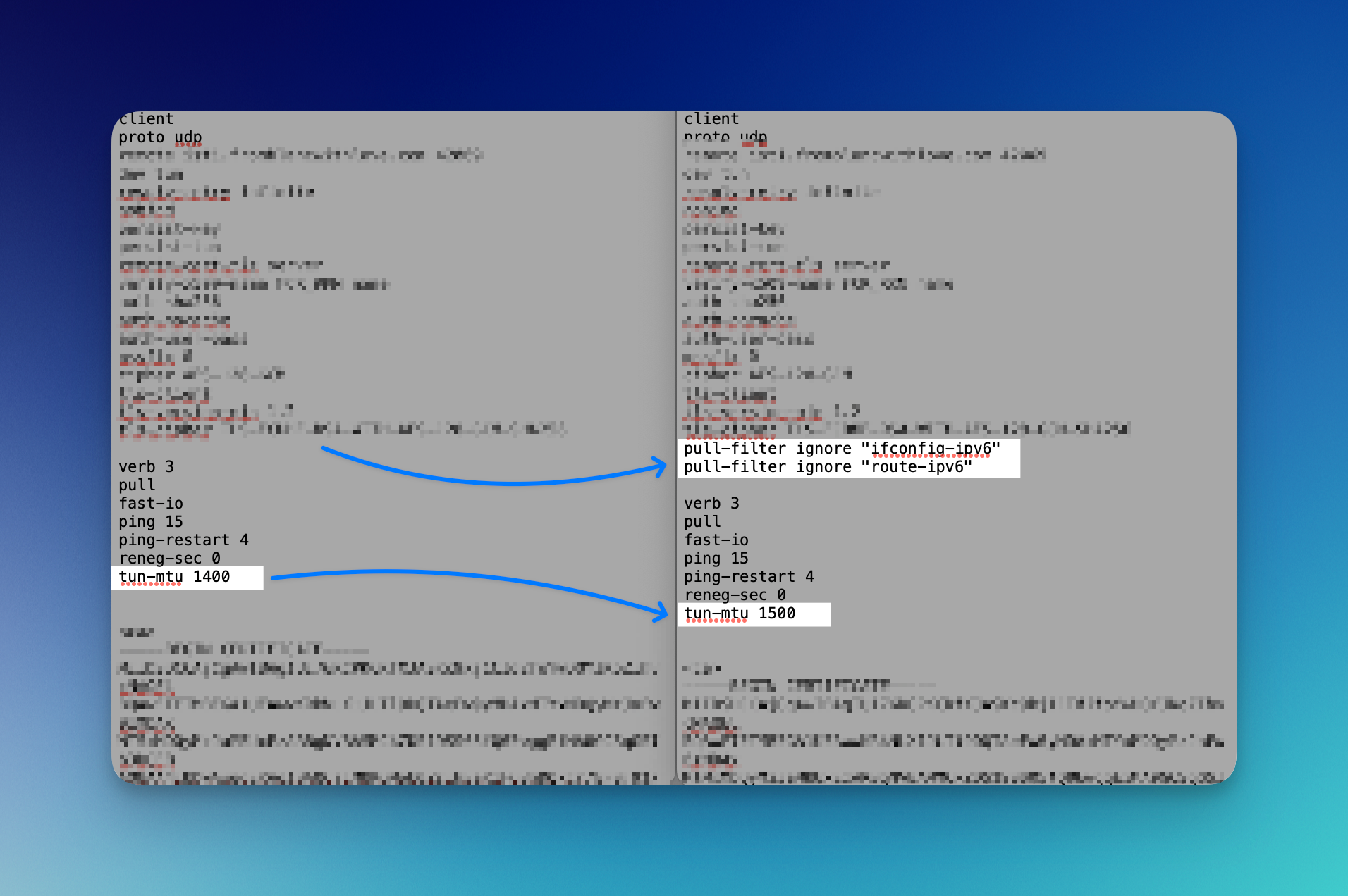 tun-mtu 1400and change it totun-mtu 1500.Above edited line, add the following lines, as shown in the screenshot: