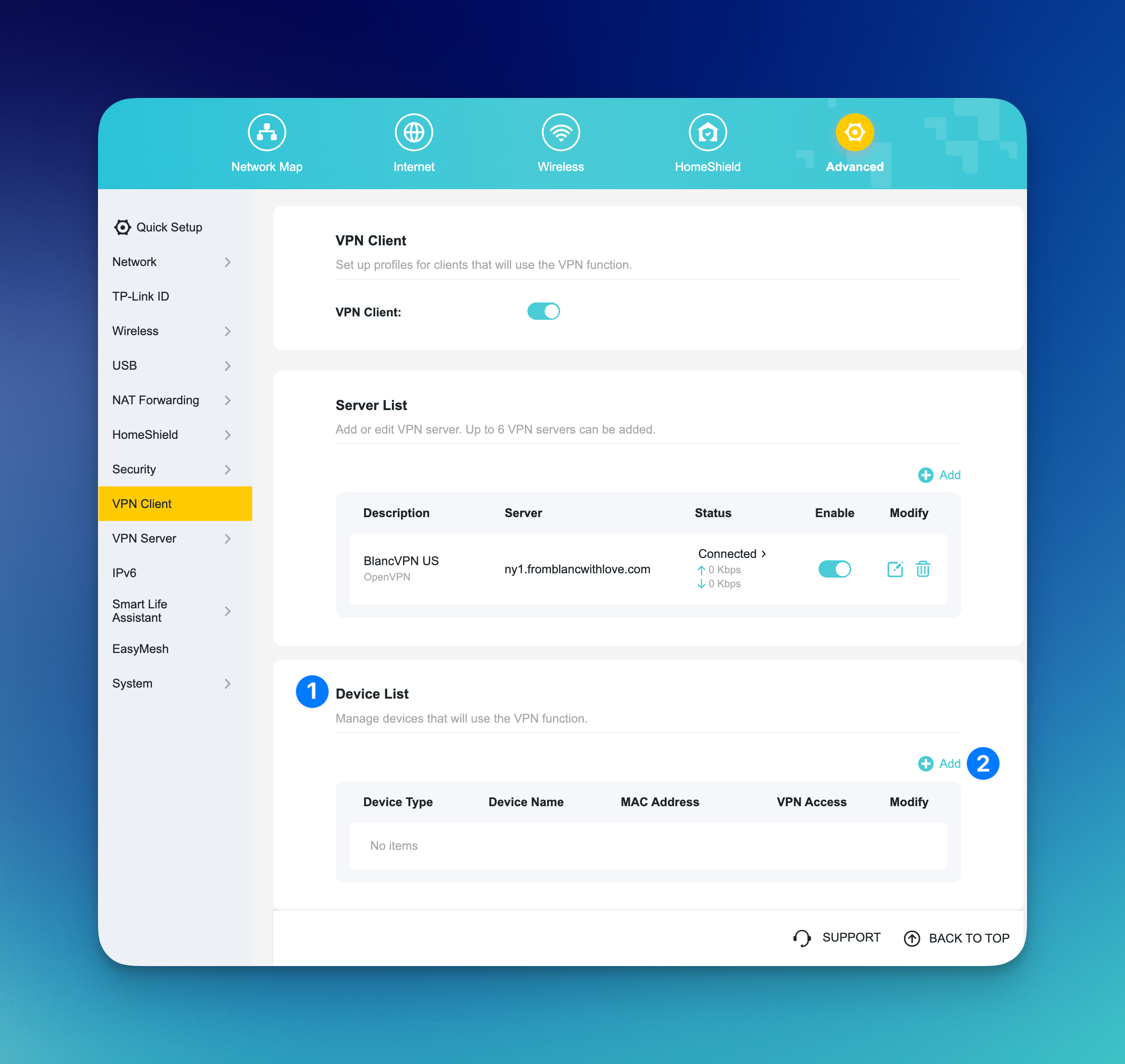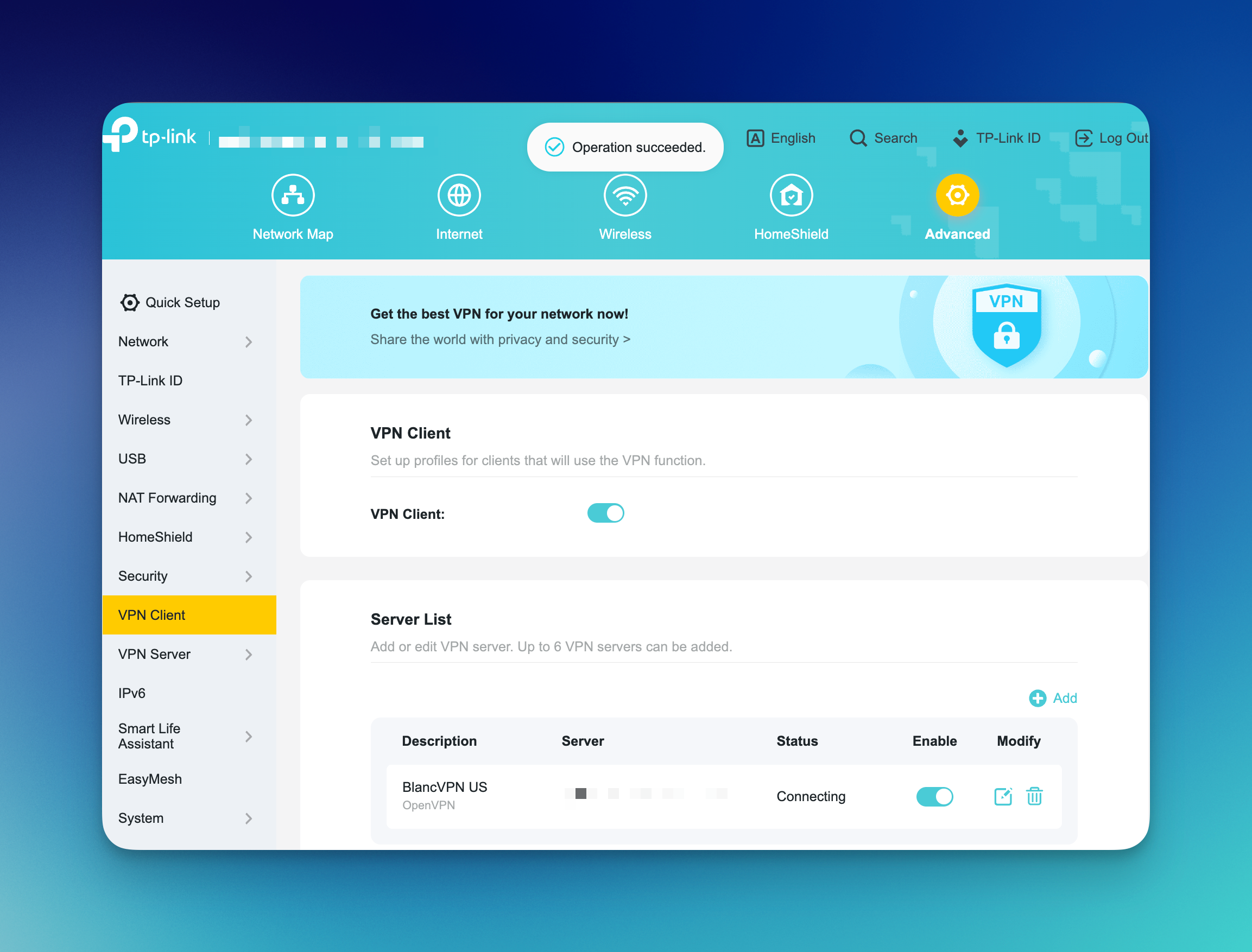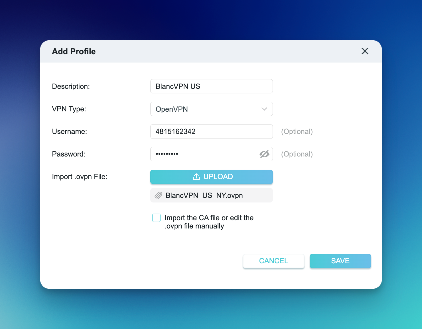 Get the .ovpn configuration file from your BlancVPN account. Click Install → choose the device → Another VPN client → go to setup guide → TP-Link → in the Location and protocol column choose OpenVPN and the desired location → download the .ovpn configuration file and copy your login and password.