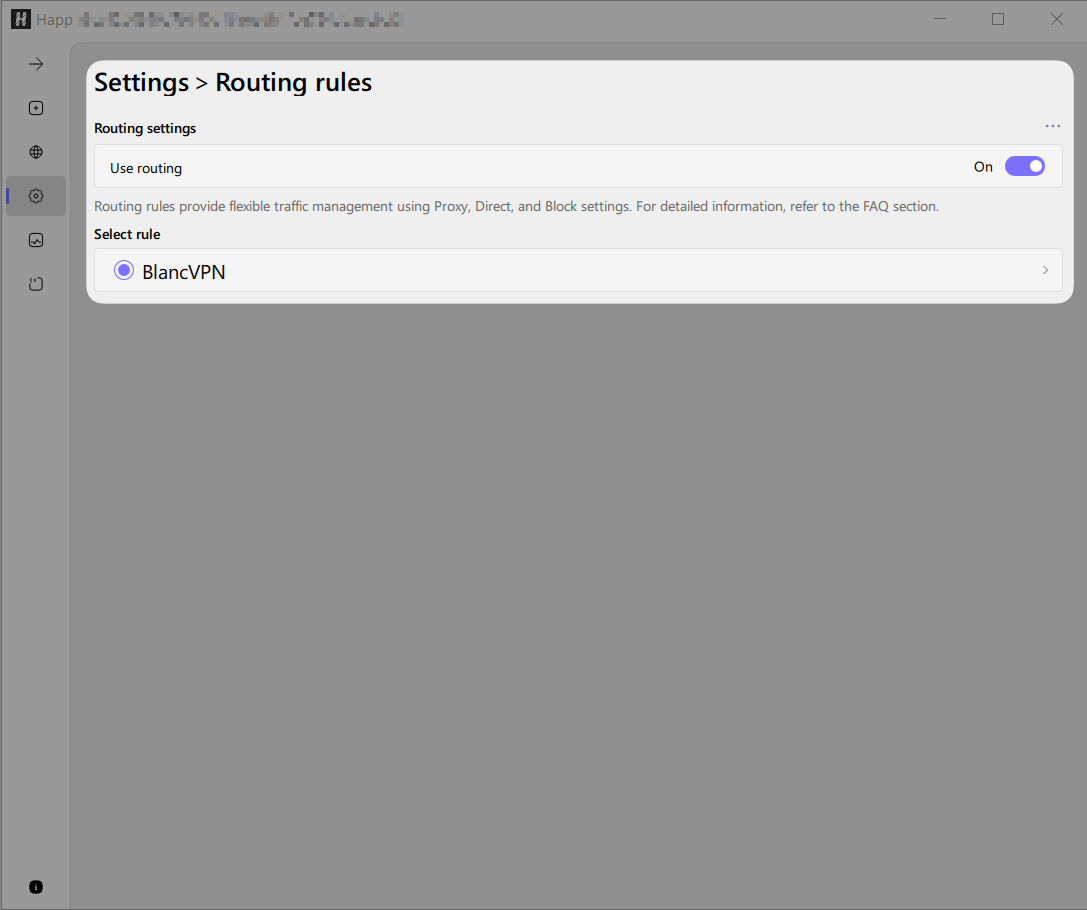 Happ 앱에서 왼쪽 상단의 톱니바퀴 버튼을 탭한 후 → Routing Rules를 선택하세요. 라우팅이 적용된 BlancVPN 항목이 표시됩니다.