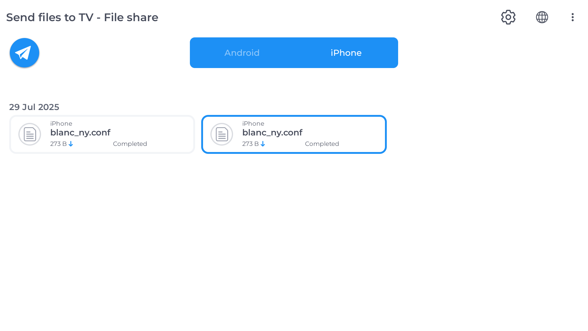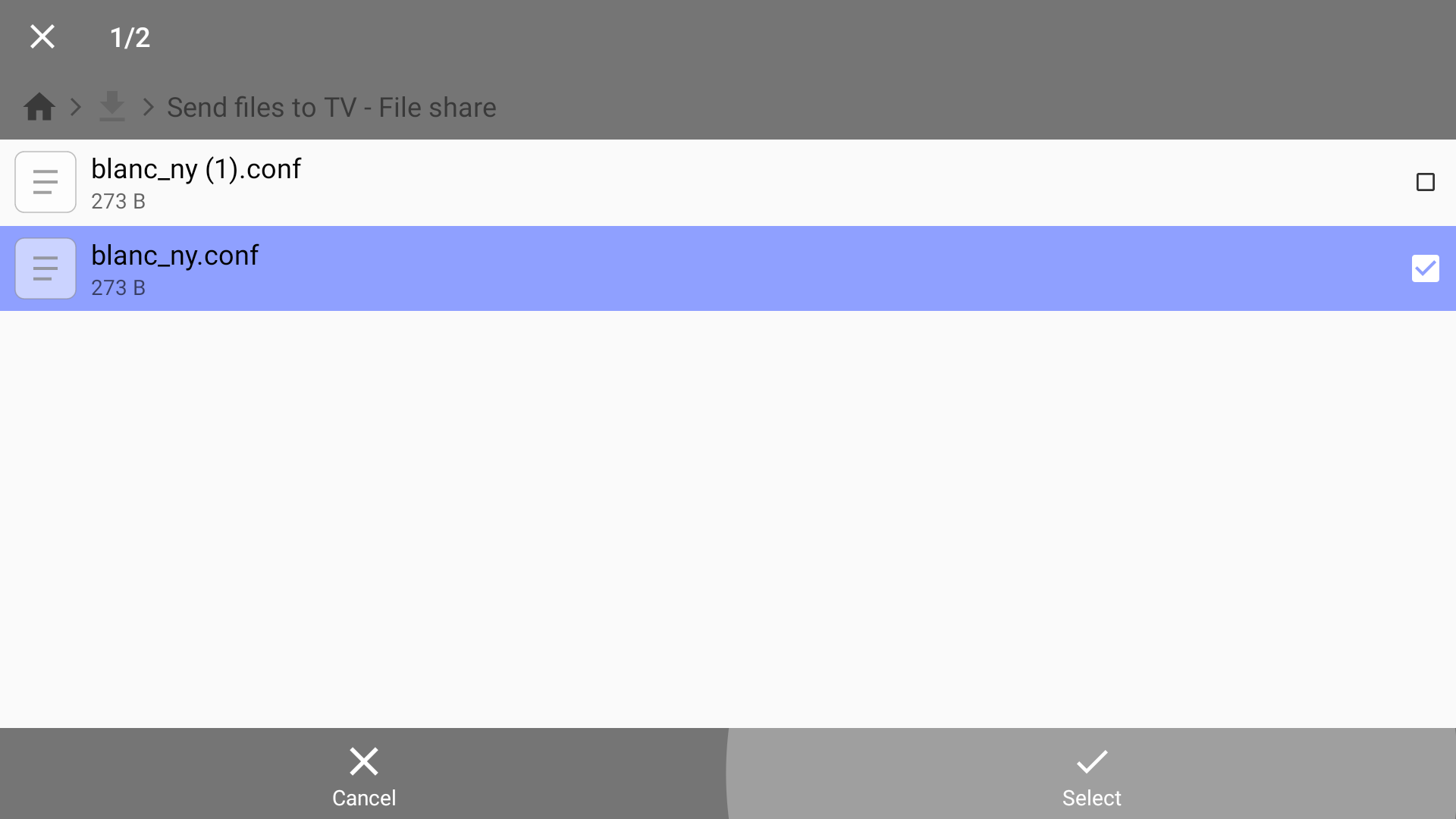 파일 관리자에서 Local → Downloads → Send files to TV 순으로 이동한 뒤, 업로드한 .conf 파일을 찾아주세요.