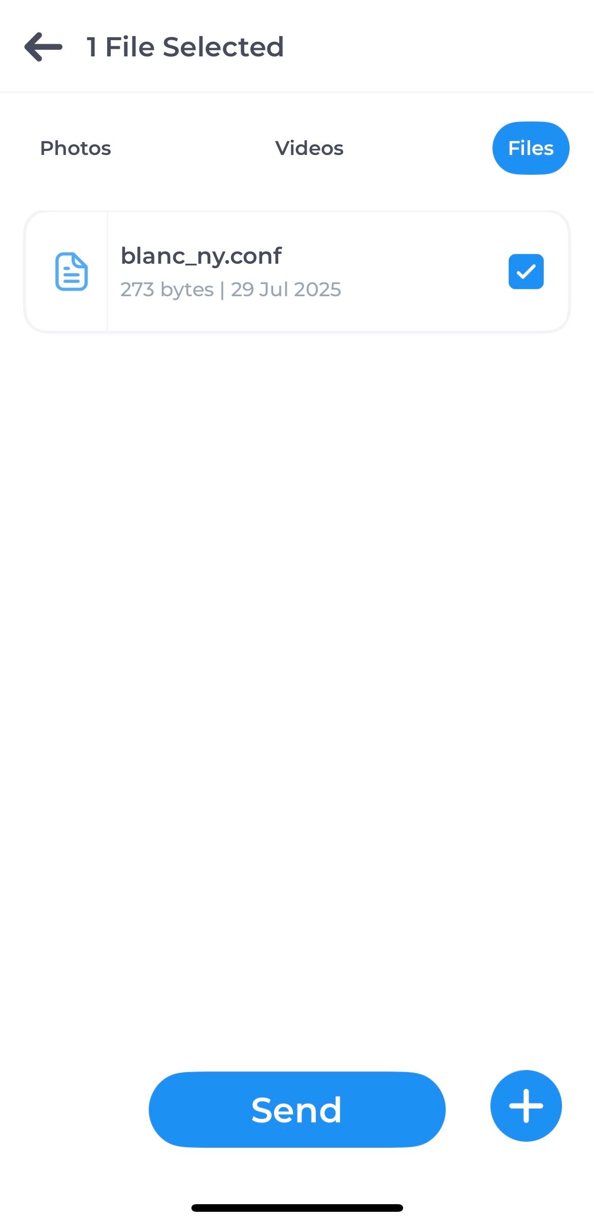 그다음, Files 탭으로 이동해 다운로드한 구성 파일을 선택하고 Send 버튼을 탭하세요. 그런 다음 Android TV에서 Send Files to TV 앱을 여는 것도 잊지 마세요. 스마트폰 화면에 연결 가능한 기기가 표시되면, 원하는 기기를 선택해 구성 파일을 전송하면 됩니다.