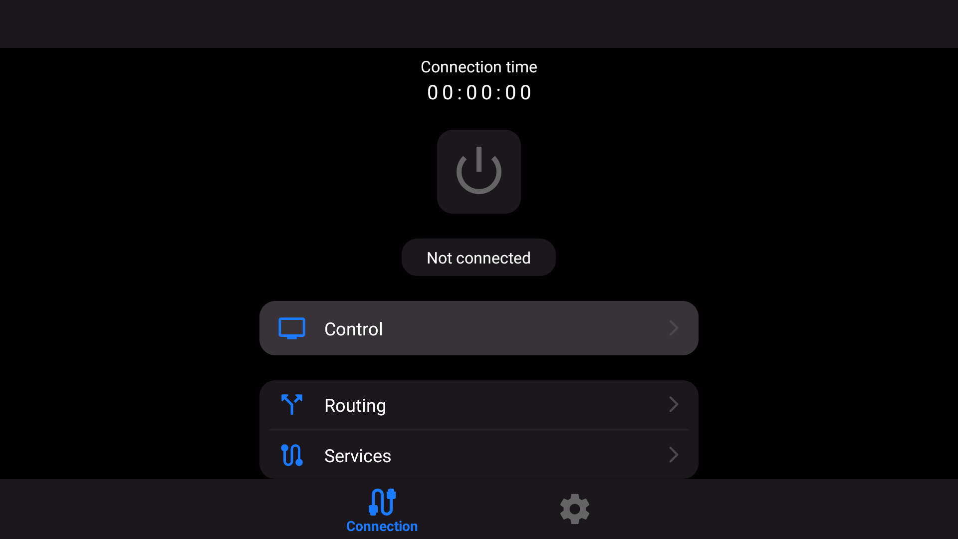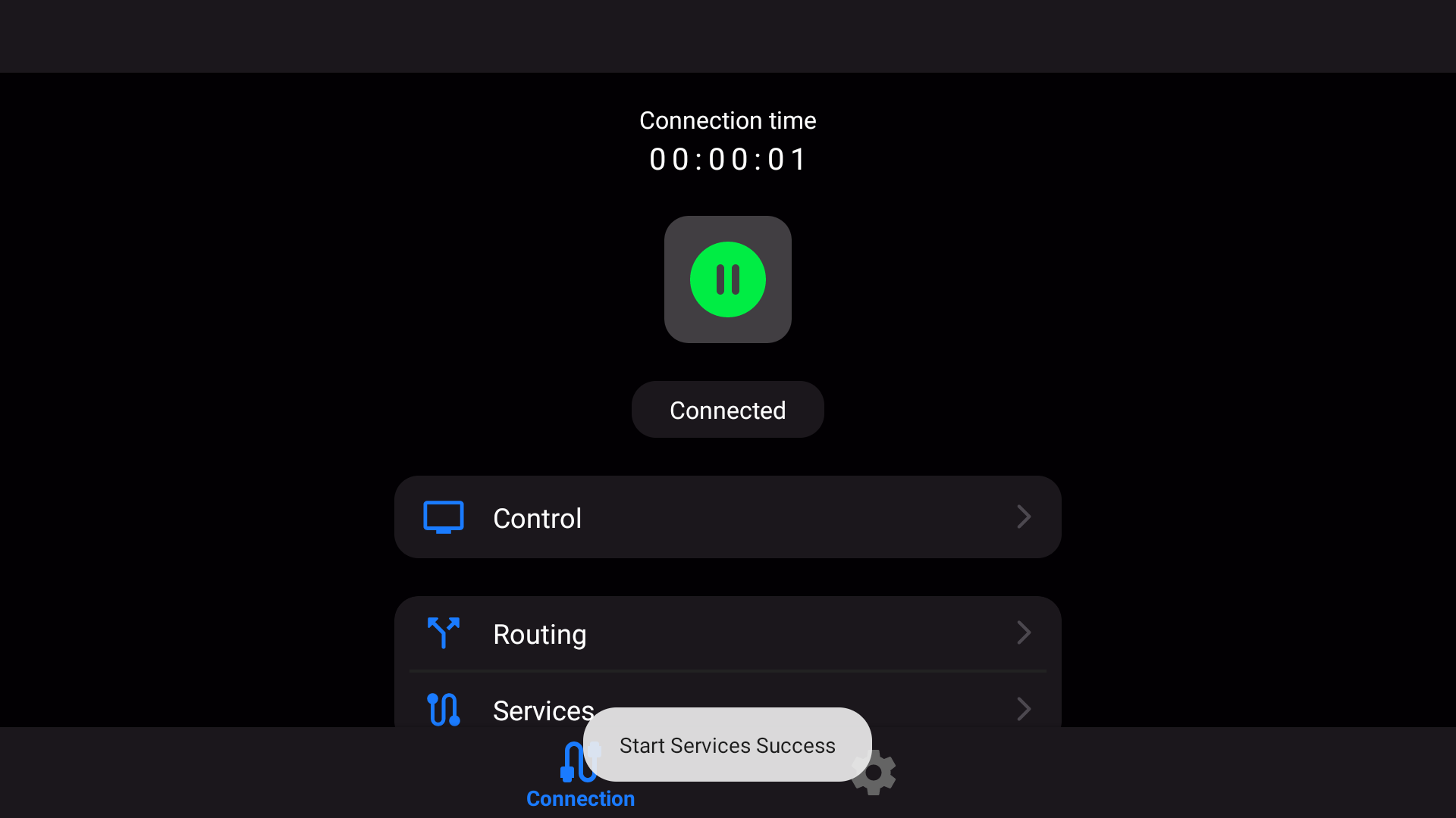 버튼이 녹색으로 바뀌고 상태가 Connected로 변경되며 "Services successfully started"라는 메시지가 표시됩니다.